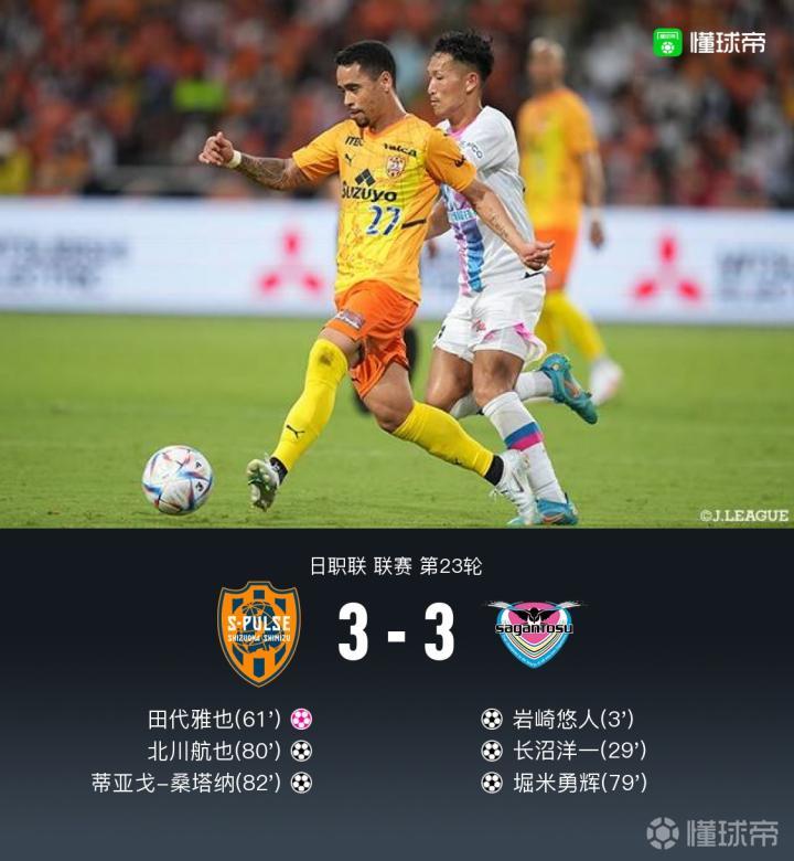 北京时间7月31日17:03,2022赛季J1联赛第23轮的最后一场较量,清水心跳坐镇IAI日本平球场,迎战鸟栖砂岩。上半场,森谷贤太郎助攻岩崎悠人闪击,宫代大圣助攻新援长沼洋一扩大比分,清水心跳暂时0-2鸟栖砂岩;下半场,山原怜音助攻白崎凌兵扳回一城,堀米勇辉远射破门,白崎凌兵和蒂亚戈-桑塔纳3分钟连进两球神奇扳平比分。最终,清水心跳主场3-3绝平鸟栖砂岩。
