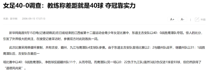2006年,江西省第十二届运动会女足青少年比赛中,东道主吉安队在80分钟的比赛中,以40-0战胜鹰潭队,平均2分钟打进一球。赛后输球的鹰潭获得赛事“道德风尚奖”。