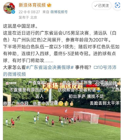 中国足球为何成绩糟糕,萎靡不振,已经是多年来一个社会难题。如果从概率学上分析,再美丽花朵也有蛀虫,足球比赛无法杜绝假球的话,那么当这种假球蔓延到青少年层面,还是多少让人痛心和感到无助。