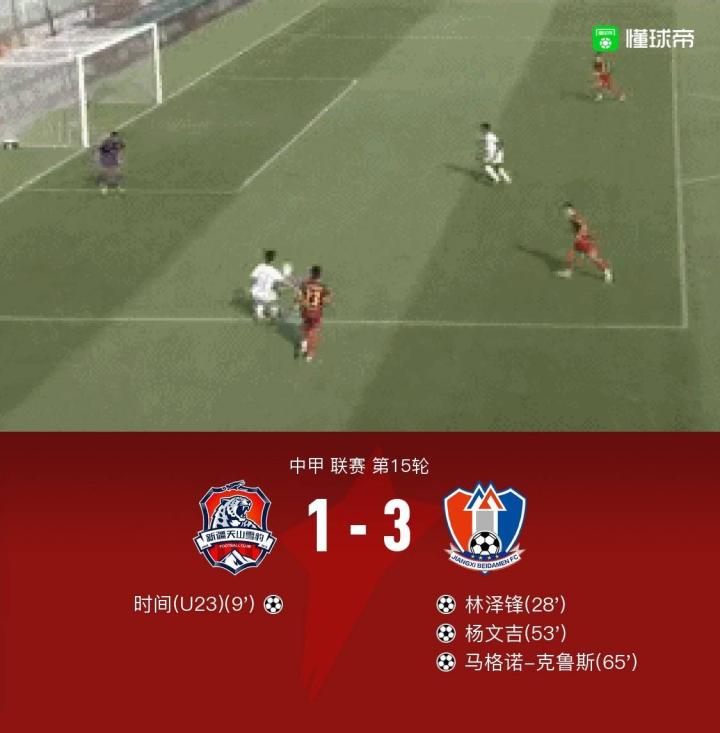 北京时间8月13日16:00,中甲第15轮比赛,新疆天山雪豹对阵江西北大门。上半场,时间开场不久就低射破僵,叶尔凡进球被吹,林泽锋抓住机会断球后小角度兜射扳平;下半场,杨文吉头槌帮助江西反超,马格诺上演精彩1v2转身抽射破门,最终江西3-1逆转新疆。