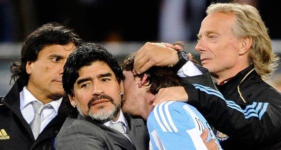 06年和10年,双方则是两次在1/4决赛相遇。06年阿根廷明明无论在实力还是在比分上都占据优势,却被K神绝杀扳平在前,神秘纸条扰乱心智在后。10年坐拥“两王四个二”,马大帅却不是一个扑克大师,如此豪华的阵容依然难逃被德意志屠杀的厄运。这次在阿根廷身上捅刀子的,依然有克洛泽的名字。而且,为德国秒开纪录的穆勒,明天还会是阿根廷需要重点盯防的选手之一。