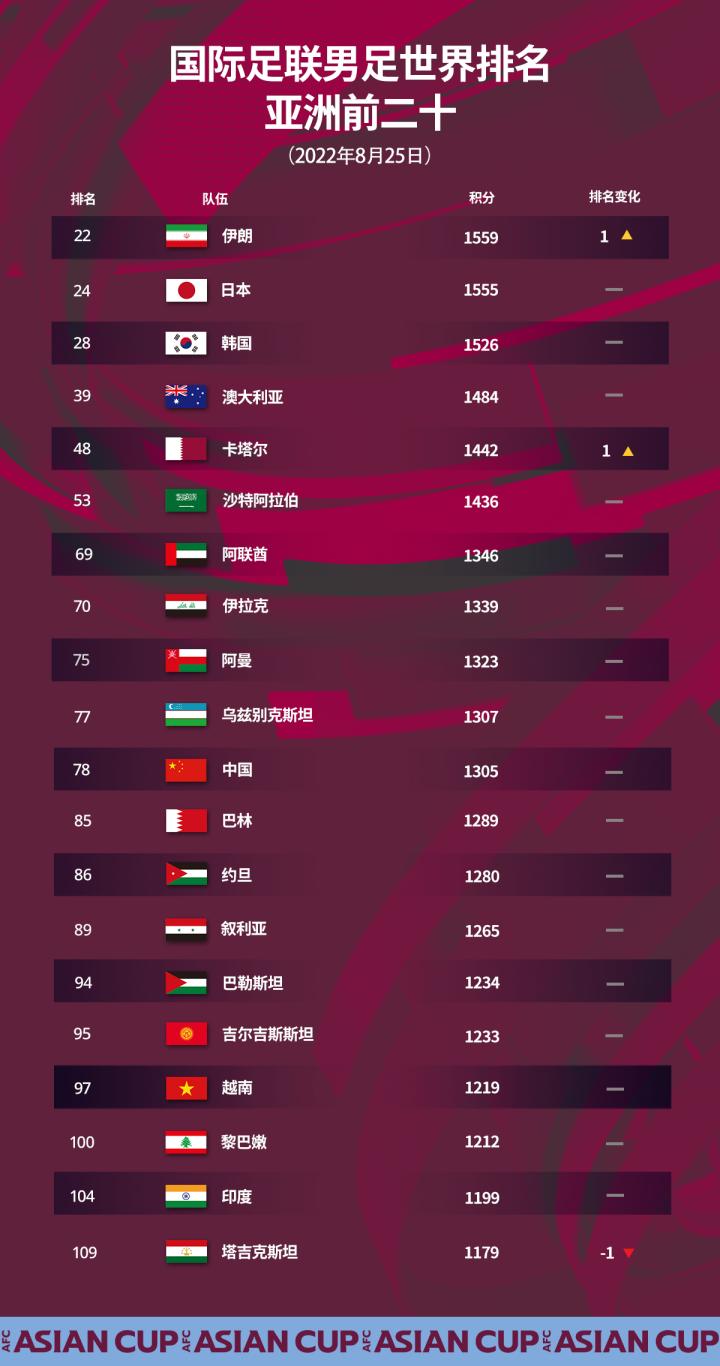 新一期国际足联男足世界排名公布! 中国足球队 排名保持不变,位列世界第78,亚洲第11; 伊朗排名上升1位,排名亚洲第一;日本、韩国分列二、三位。