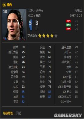 在分项数据中,梅西速度92分、盘带95分、射门88分、防守24分、传球86分、身体素质62分,技术等级四颗星。