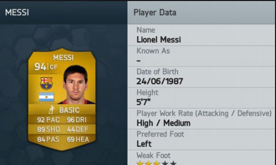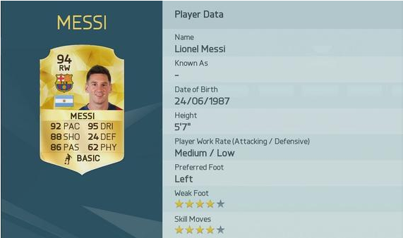 在满分100的总分上,梅西得到了94分,比起FIFA15还上涨了1分,现在的位置更多的是RW,可以说这是梅西最好的一年。