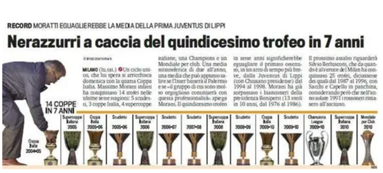 但与疯狂的烧钱形成鲜明反差的是,在马西莫上任的前十年,国际米兰仅仅可怜地收获了一个联盟杯和一个意大利杯冠军。国际米兰成了“球星黑洞“,被嘲讽、被谩骂。