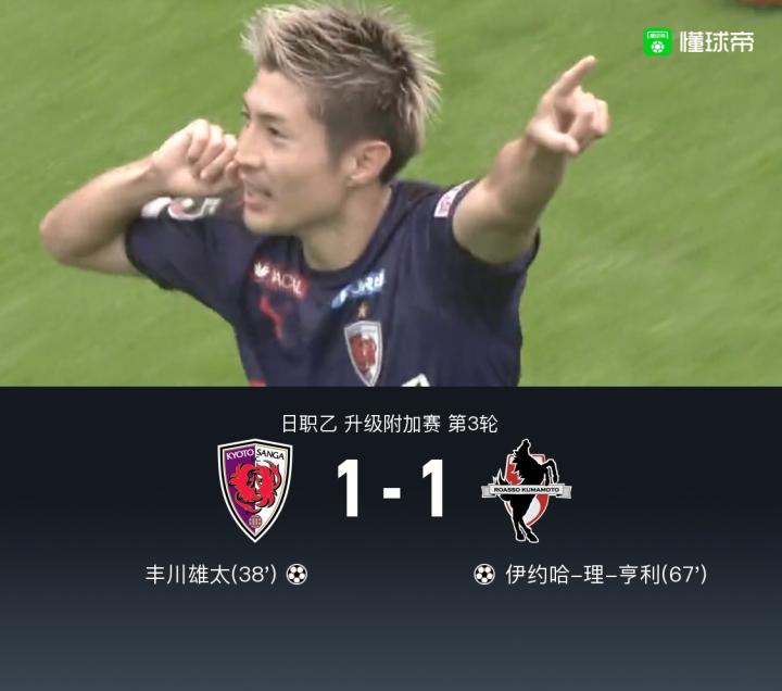 第68分钟,河原创角球开出,伊约哈-理-亨利前点头球破门,京都不死鸟1-1熊本深红!