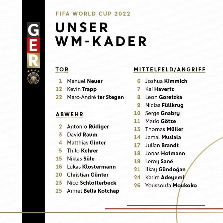经历了上届世界杯的耻辱,这一届的德国战车有望再创辉煌。德国队的特点是,没有一个位置存在绝对的短板。首先是锋线,老将穆勒领衔,萨内、格纳布里等球员都正逢当打之年。中场方面,后腰核心基米希领衔格雷茨卡、京多安、哈弗茨,以及状态神勇的新星穆夏拉,在当家巨星克罗斯缺阵的情况下,依旧能保证中场阵容的强大。后防线上,吕迪格、聚勒等也逐渐成长为继胡梅尔斯、博阿滕之后的接班人。门将位置上,德国同巴西一样,都有着足够的板凳实力,诺伊尔和特尔施特根,都是能够拿得出手的一流门将。德国小组赛的路并不好走,面对劲敌西班牙,以及实力不容小觑的日本和哥斯达黎加,如何利用球员优势做好阵容轮换,以及如何考虑淘汰赛的安排,是德国队能否走得长远的关键。毕竟,要力争小组赛第一,那么就要有1/4决赛打巴西的心理准备,如果只是拿到小组第二,那么大概率1/8决赛就要遭遇劲敌比利时。到底力争第一还是妥协第二,这个抉择会很尴尬…