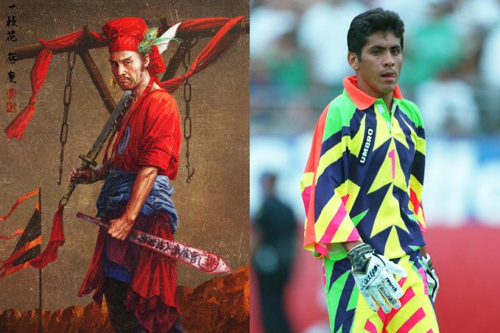 坎波斯,墨西哥著名门将,世界杯历史上服装最耀眼的球星。据说有心理学研究表明,球员在射门的时候会下意识的瞄准一个最明显的目标。坎波斯深信这一理论,因此每次登场都穿着花花绿绿的比赛服,目的就是提高守门的成功率。正因如此,球迷们送给他“花蝴蝶”的绰号。值得一提的是,这些极具个性的比赛服都是坎波斯自己设计的。虽然真实身高只不足1.70米,但坎波斯拥有惊人的弹跳力,而且反应敏捷,战位出色,出击时间准确果断,是上世纪90年代世界足坛最优秀的门将之一。他参加过1994年、1998年和2002年三届世界杯。1994年世界杯,墨西哥队所在小组出现了戏剧性的一幕:小组赛战罢四支球队都是1胜1平1负,且净胜球都是0,墨西哥队最终以进球数的优势斩获小组头名。坎波斯在比赛中高接抵挡,为球队出线立下了汗马功劳。其翩翩起舞的场景,给全世界球迷留下了深刻的印象。1/8决赛,墨西哥队与本届比赛的最大黑马保加利亚队相遇,双方鏖战120分钟踢成1-1平。点球大战中,坎波斯扑出了对方球员巴拉科夫几乎踢进死角的射门,这是其职业生涯中最经典的扑救之一。虽然墨西哥人最终遗憾的输掉了比赛,但花蝴蝶却凭借出色的表现在本届比赛中一战成名。在最佳门将的评选当中,坎波斯名列第三。时至今日,谈到世界杯赛场上的门将,花蝴蝶依然是个美丽的传说。