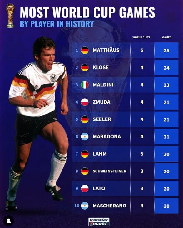 卡塔尔世界杯即将开始,德国知名足球数据网站“转会市场”列出了世界杯历史上的参赛场次数排名。德国足坛名宿马特乌斯参加过5次世界杯,一共25场,是参加世界杯场次最多的球员。