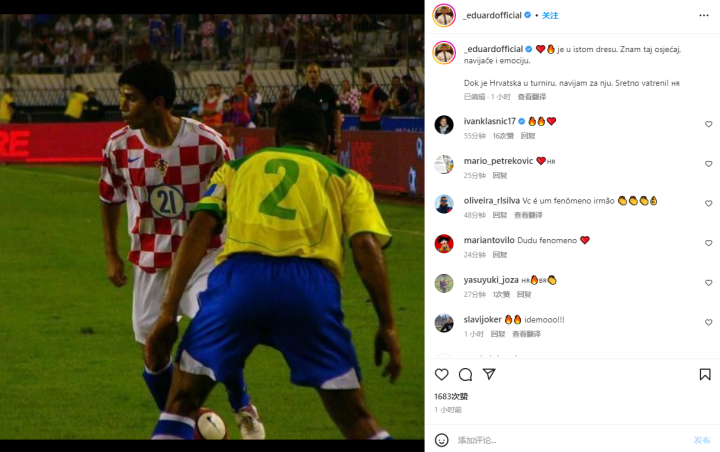巴西裔克罗地亚前国脚爱德华多·达席尔瓦在社交平台上传了一张2005年8月球员时期的自己代表克罗地亚对阵巴西的照片,并用克罗地亚语发文:”同样的球衣。我知道那样的感觉、球迷和情绪。当克罗地亚参加赛事时,我支持他们。好运vatreni(克罗地亚男足的昵称)!” 1998年,15岁的爱德华多从巴西来到萨格勒布迪那摩的梯队;2002年他获得克罗地亚国籍,2004年在U21欧锦赛决赛阶段首次得到克罗地亚国字号征召。 爱德华多最后一次随克罗地亚出征是2014年的世界杯。那届杯赛中克罗地亚成为了东道主巴西的揭幕战对手,不过爱德华多没有在这场比赛中登场。 2019年1月1日,爱德华多在华沙莱吉亚正式退役,目前仍在巴西常住。