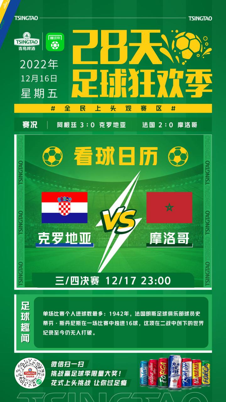 摩洛哥的最大城市是卡萨布兰卡(达尔贝达),首都则是拉巴特。但实际上,拉巴特直到法国人在20世纪初控制摩洛哥后才成为政治中心,而此前摩洛哥的首都长期设在内陆的非斯,它早在9世纪初就成为摩洛哥伊德里斯王朝的都城,至今仍为摩洛哥第二大城市。恩-内斯里就出生在非斯,他能在对阵克罗地亚的三四名决赛中取得进球吗? 作为熬夜观赛的必备伴侣之一,青岛啤酒策划了“28天足球狂欢季”线下观赛活动,花式足球挑战、组团PK等活动等你畅玩!扫描底部微信小程序二维码,进行报名! 进入小程序,还可参与青岛啤酒28天花式上头挑战,丰富奖品等你赢取! 另外,参与青岛啤酒#为热爱举杯 专栏话题讨论“作为球迷的你,更看好哪一支球队呢?”,我将从话题讨论页中选取出一位幸运球迷,送出青岛啤酒1903炫彩加油罐一箱!