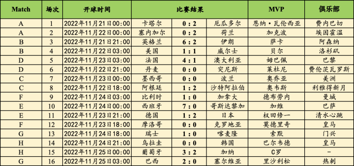 完全赛果及单场比赛MVP一览: