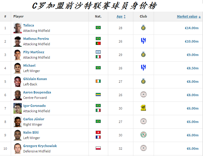 沙特联赛中身价最高的是刚刚加盟利雅得胜利的C罗,37岁的葡萄牙巨星目前的最新身价为2000万欧元。