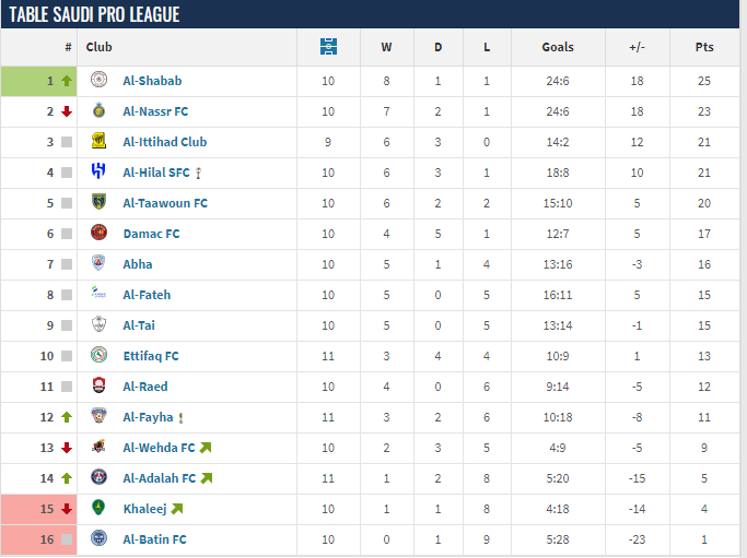 截至笔者发稿前,本赛季沙特联赛已经进行了10轮的角逐,目前利雅得青年以2分优势领跑积分榜,利雅得胜利和吉达联合分列二三位,两者相差2分。