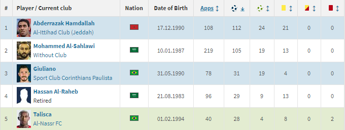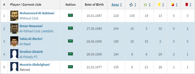 出场记录:球队历史出场次数最多的是本土前锋默罕默德-萨赫拉维(219场,105个进球),这名现年35岁的沙特前国脚同时位列队史射手榜的第二位。