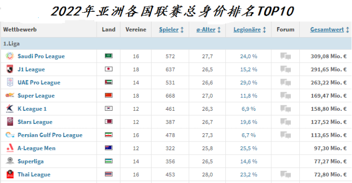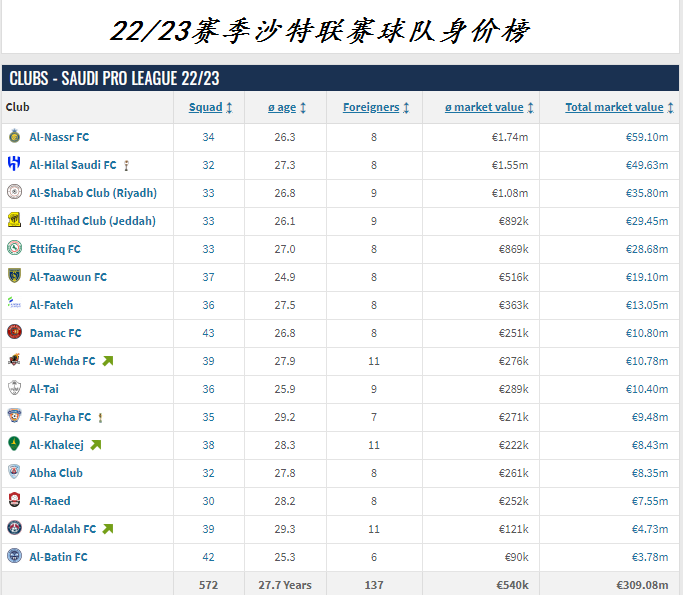 本赛季沙特顶级联赛共有16支球队,总身价约为3.09亿欧元,超过了日本J联赛成为了亚洲总体身价最高的联赛。