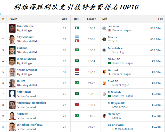 其中转会费最高的是2018年夏天从英超莱斯特城引进的穆萨,这名花费了球队1650万欧元的尼日利亚前锋仅为球队在2年内贡献了11个进球后就自由离队。此外阿根廷中场马丁内斯和巴西前锋久利亚诺都花费了俱乐部超过1000万欧元的转会费。