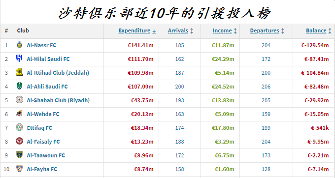 利雅得胜利在近十年共计投入了约1.41亿欧元的引援资金,是同期投入最大的国内俱乐部,比利雅得新月多投入了约4200万欧元。