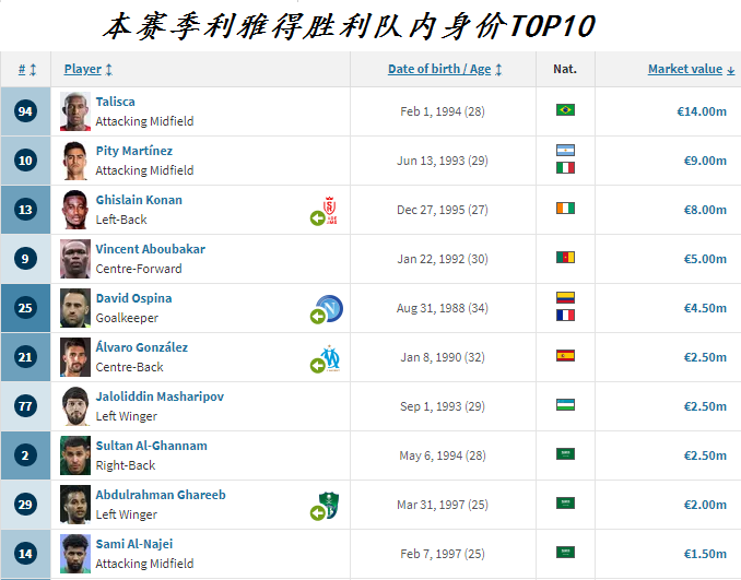 沙特联赛中身价排名前三的正是利雅得三强,其中身价最高的是利雅得胜利(5910万欧元),利雅得新月和利雅得青年分列二三位。