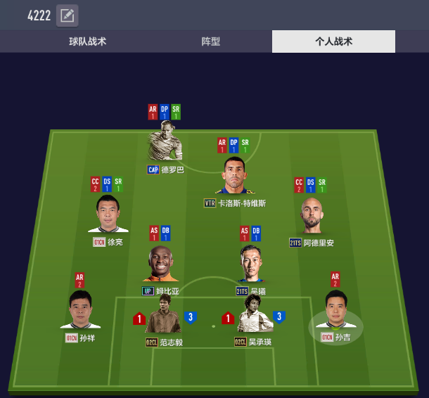 ○ 个人战术中,除了中卫的球员攻防参与度不需要调整,让球员自行选择前插跑位即可,因为4222整体就是442的变形,无论是进攻还是防守都相当均衡;边前卫建议选择参与回防,毕竟相对众多4231阵型而言,缺少中场的防守,需要边前卫拥有充沛的体能;前场两名球员尽可能前插跑位。