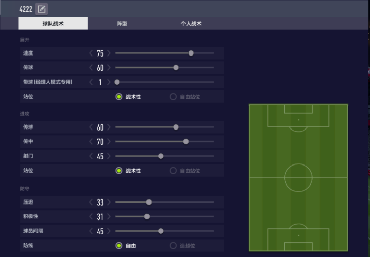 首先是球队战术板方面,在之前战术板各项名词解释时已经提到过: 展开一栏速度设置在70以上时可以让球员跑动更积极,而传球60左右可以使传球组织空间更加开阔,适合过顶直塞。