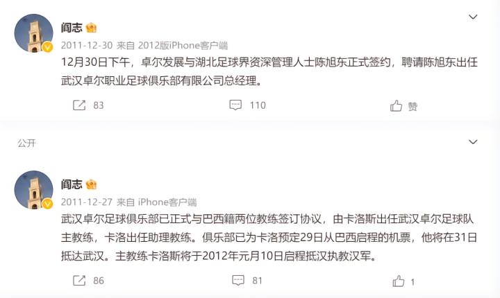 在武汉卓尔成立伊始,很多教练组和球员聘用的信息更新都是在阎志的个人微博上发布。
