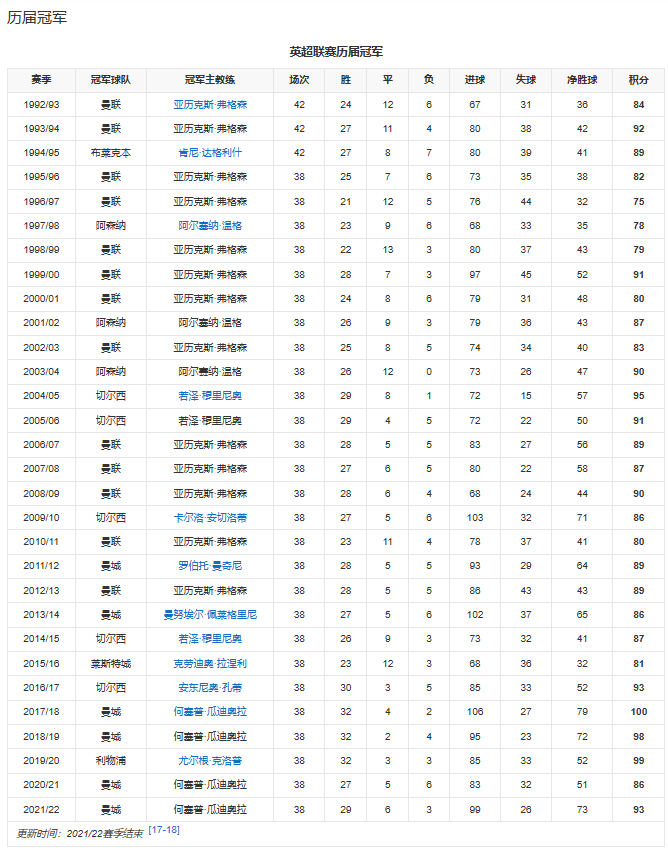 2017-2018赛季曼城创造了半程55分(满分57分)的英超记录,最后以创纪录的积分100分夺冠。