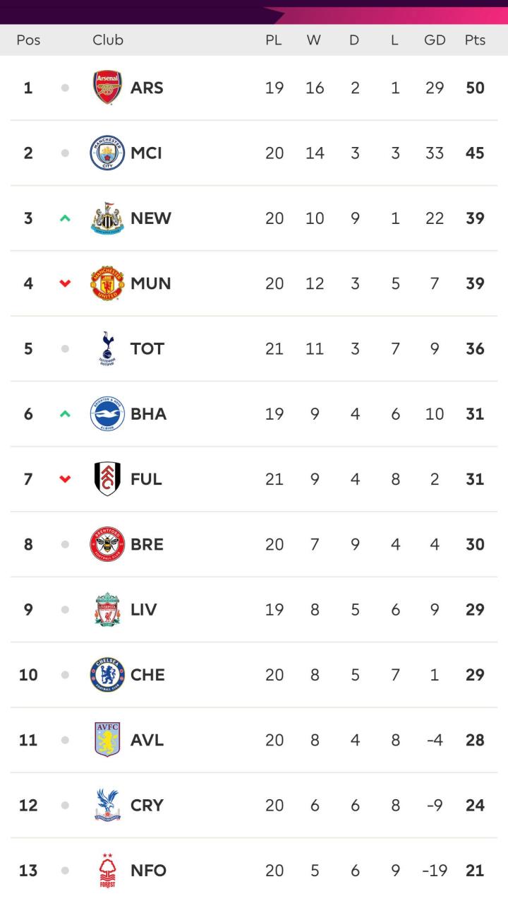 2022-2023赛季英超赛程过半,目前排名如下: