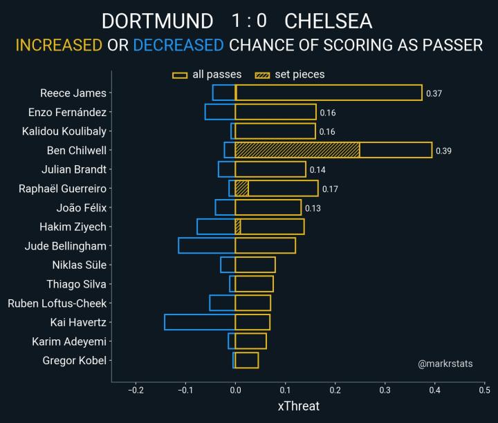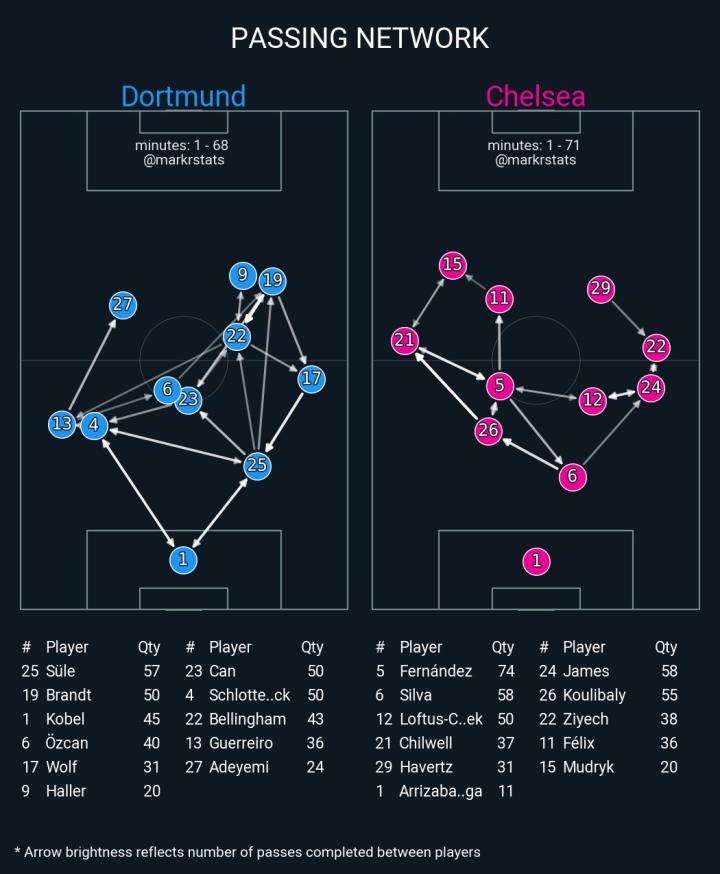 两名边后卫奇尔韦尔和里斯·詹姆斯的传中能力都不错,中路好好设计包抄很重要。在包抄点到位效率上,这一点多特做的要比切尔西好。
