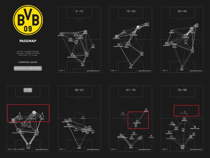 站位图上也能看出,两名边锋布兰特和阿德耶米相对都收的比较靠内线。两侧交给边后卫来冲刺,贝林厄姆的位置压的非常靠上。因为埃姆雷詹的保护,另一名后腰厄兹詹也可以有一些向前的移动。
