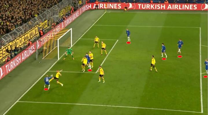 这次传中时,多特的整个后场站位都是乱的,切尔西在中路有库利巴利和哈弗茨两个大空位的包抄点,甚至还有在内收的齐耶赫。而多特只有一条后卫线,退到了小禁区。即便如此,切尔西都没能收获进球。