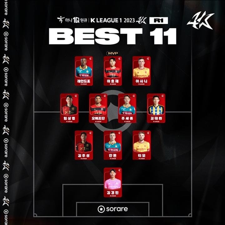 2月28日,2023赛季K1联赛首轮各项最佳出炉。MVP由浦项铁人的中锋李昊宰获得,他在替补登场后完成两粒进球,帮助浦项逆转比赛。而浦项铁人也因为在与大邱FC的比赛中2度落后,2度扳平,最终完成逆转,获得了新赛季的首轮最佳球队。