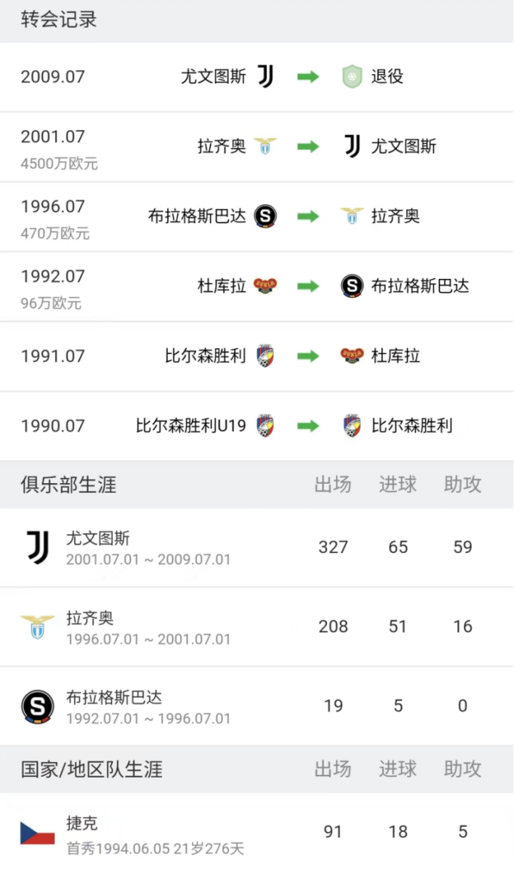 内德维德出道于比尔森胜利青年队,在拉齐奥成名,在2001年夏窗以4500w欧元的转会费加盟尤文图斯,随后也见证了尤文的低谷和辉煌,他的生涯也是颇具传奇色彩。