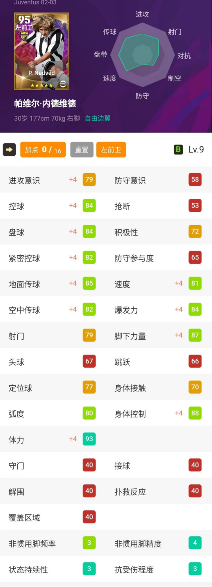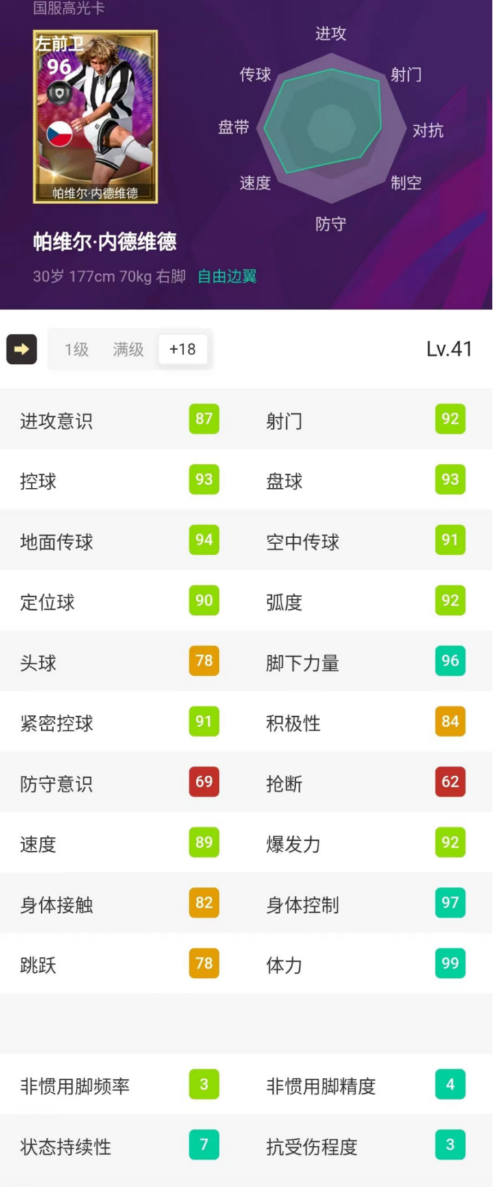 这张高光内德维德的数据还是不错的,身高177cm、体重70kg,模型比较标准,在边路基本够用。铁人嘛,优势肯定是体力,内德维德99的体力也保证了他发挥的下限。一个B状态且打满全场都不需要换人的边前卫,在实况手游里可谓是凤毛麟角。而且这张高光铁人的身体控制也接近拉满,手感确实很灵活。除此之外,他的双速也都在90左右,在边路突破加速过人都没有什么压力。除了抢断和防守意识比较差之外,内德维德也没有什么缺点,稍差一些的属性也都有80左右,其他各项进攻数据基本都在90以上,还是非常全面的。