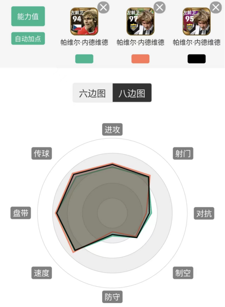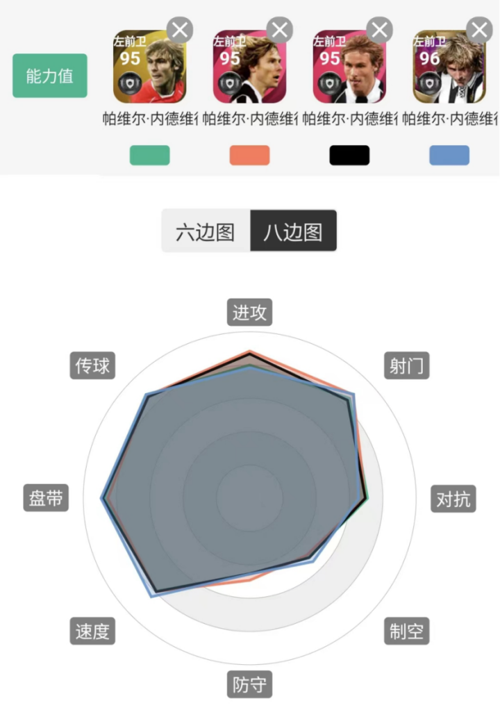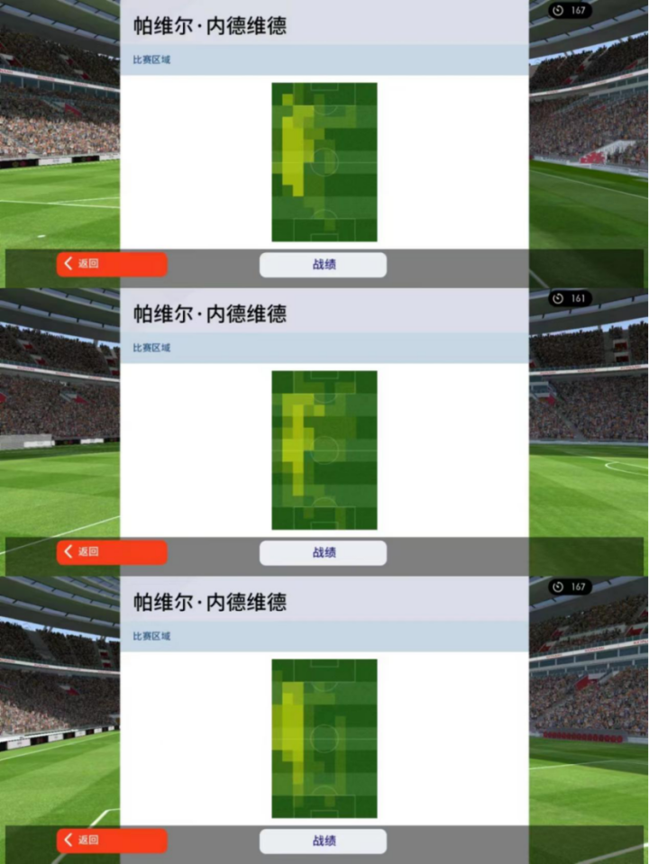 在其他位置中,笔者觉得内德维德打右边前卫和左右边锋时效果也都不错,因为都能触发风格,而且他还是34脚无逆足,辅以相应的传球技能,让他传射俱佳,表现都比较亮眼。单从单兵能力上来看,铁人踢前腰和中前卫的硬度也够,但是吧,如果想让他像黄传铁人那么跑,也是不太现实的。高光铁人在中前卫和前腰位置的跑动覆盖面积依旧非常大,但跑位也很随意,很难串联起球队的进攻,如果打打活动赛,那没什么问题,如果打天梯赛,其实还是全能中场风格的铁人更加吃香。
