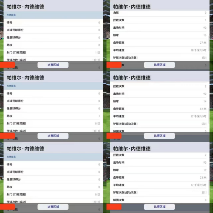 笔者选取的都是在内德维德→状态以上的比赛,打的天梯赛。这张高光内德维德的跑位还是比较符合自由边翼风格的,基本上到了中前场都比较喜欢内切,但是他们的跑位和教练阵型也有一定关系,像笔者用的加斯佩里尼,两个边前卫的位置比较靠后,所以内德维德也很少有机会能内切,基本都会集中在中场边路附近活动。如果是用4222那种边前卫比较靠前的阵型,那么铁人的内切程度就会更大。而且有一说一,铁人的跑动覆盖面积就没有不行的时候。