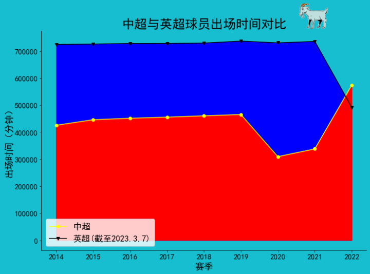 图一、中超与英超球员总出场时间对比(英超数据截至2023年3月7日)