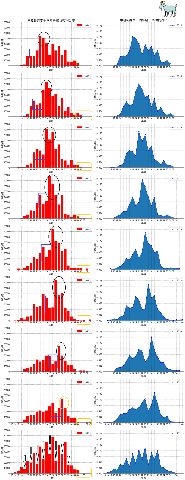 图六:2014-2022赛季中超不同年龄段球员出场时间及占比情况