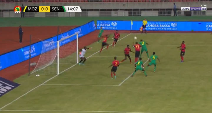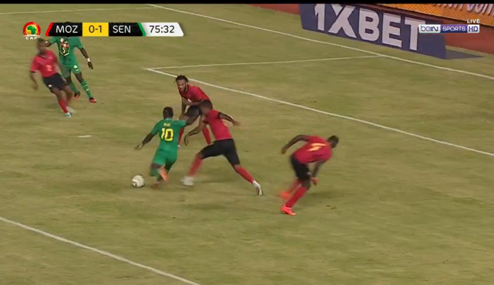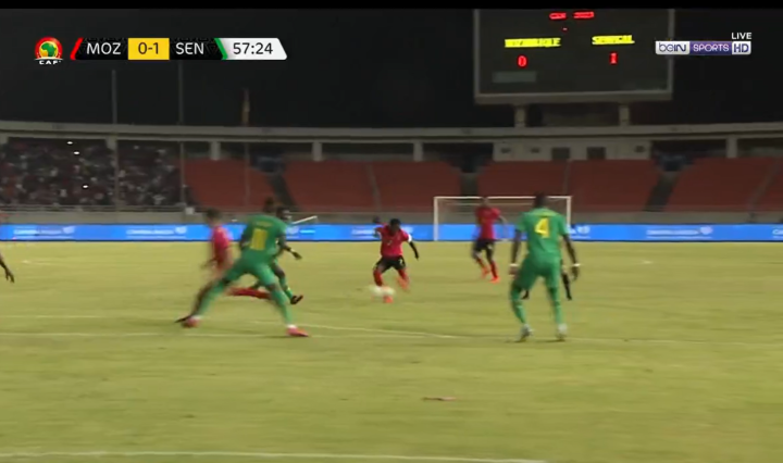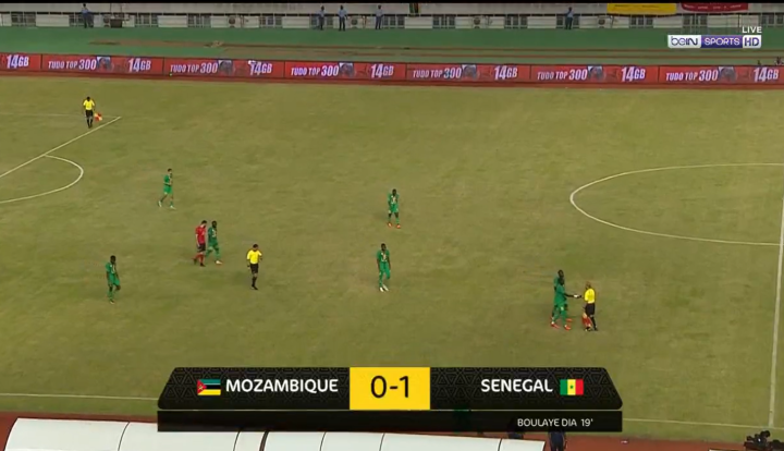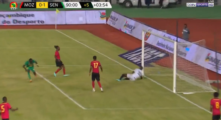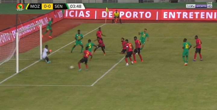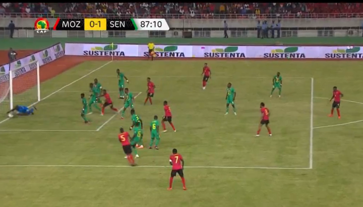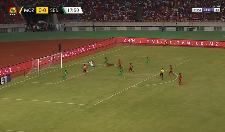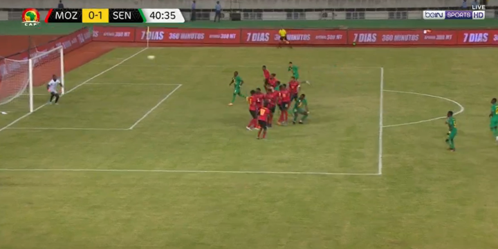 第40分钟,马内在禁区前被莫桑比克球员铲倒,主裁判判罚任意球。5号伊德里萨·格耶主罚,选择直接射门,球被门将伊瓦内双拳打出,随后被莫桑比克球员解围。