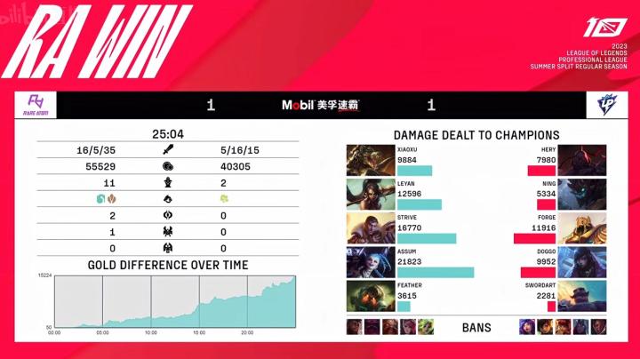 第25分钟,RA携带大龙BUFF高地击杀UP四人赢下比赛扳平比分。
