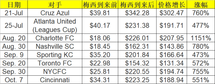 门票涨价不单是那些想要去DRV PNK球场观看梅西和迈阿密国际比赛的球迷的问题。俱乐部与洛杉矶FC、夏洛特和亚特兰大联等球队的客场比赛也面临着同样的情况。这些比赛的门票价格也出现了火箭式的上升。当梅西加盟的消息公布后,整个联盟中涉及迈阿密国际的比赛,门票价格上浮了超过1000%。其中一些是7月21日梅西完成首秀之前的比赛。
