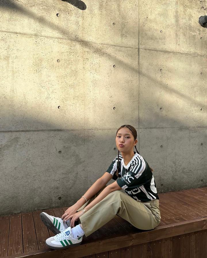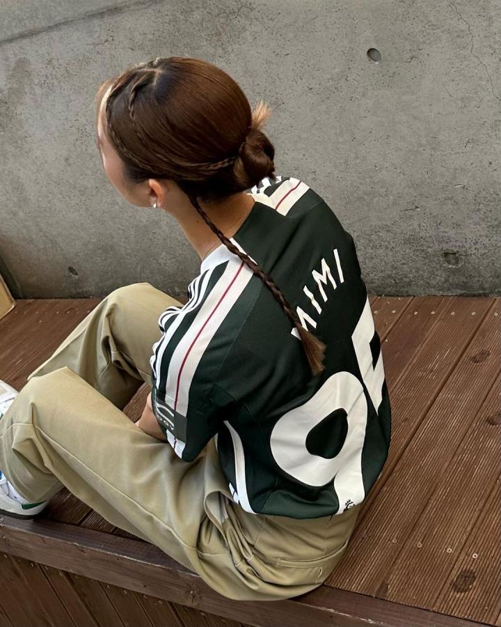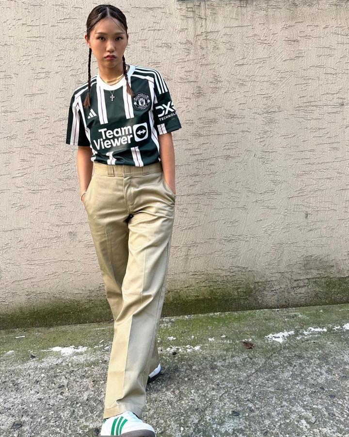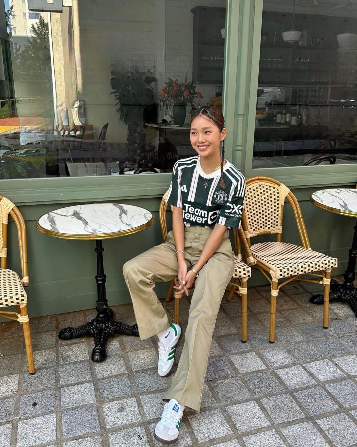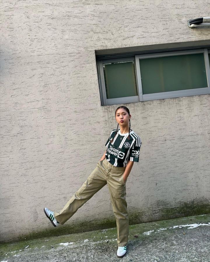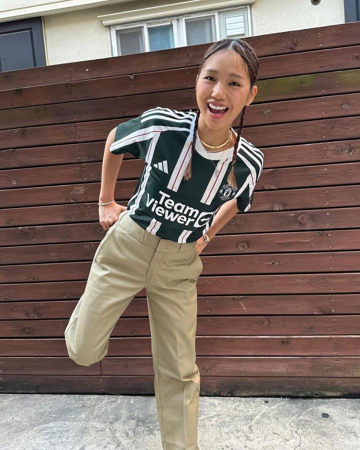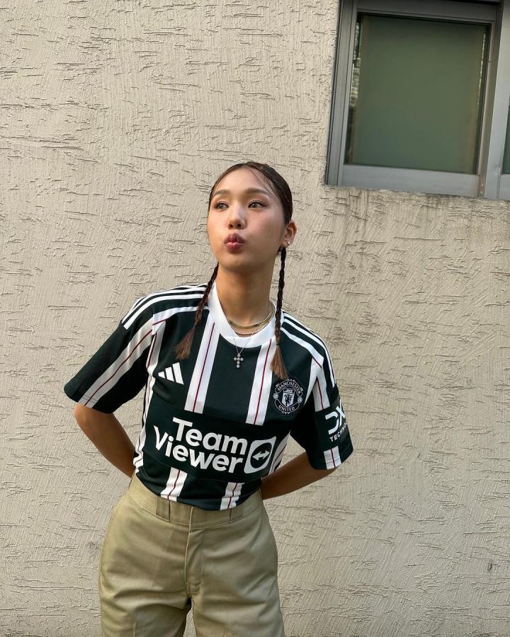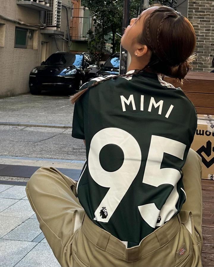 女团OH MY GIRL的成员Mimi(金美贤)展示曼联球衣。这个妹子性格真的太好了,《地球游戏厅》里面超级搞笑,长在我的笑点上。