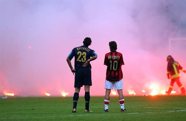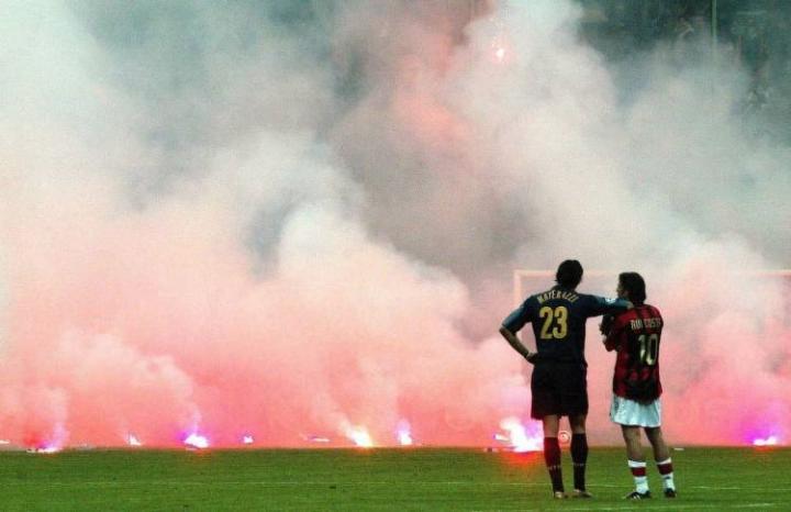 看台上投掷下的烟花棒越来越多,绿茵场成为了烽火连天的战场,比赛被迫暂停。此时,国米23号马特拉齐,将自己的右臂搭在了米兰10号鲁伊-科斯塔的肩上,他们驻足而立,眺望烟花,这一瞬间被场边的摄像师永久定格。