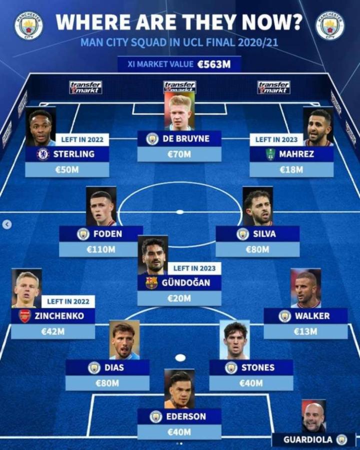 德转数据统计,盘点了2021年欧冠决赛曼城的首发...天天向上Football @懂球帝2023-11-29 19:21德转数据统计,盘点了2021年欧冠决赛曼城的首发阵容,目前只有4人离队,具体如下: 主帅:瓜迪奥拉 门将:埃德森 后卫:津琴科(2022年离队)、迪亚斯、斯通斯、沃克 中场:福登、京多安(2023年离队)、贝尔纳多-席尔瓦 前锋:斯特林(2022年离队)、德布劳内、马赫雷斯(2023年离队)展开更多