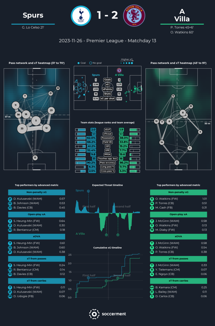 预期进球数(xG)是一个比较重要的指标,直接反映两队创造的射门机会好不好。那么这场来看,双方的xG都是一个比较高的数值(场均xG值联赛第一的曼城也就2.13),也就是说,双方都创造出了很高质量的射门机会,热刺还这边还属于进攻更有效的一方(2.56的xG对维拉2.31的xG)。