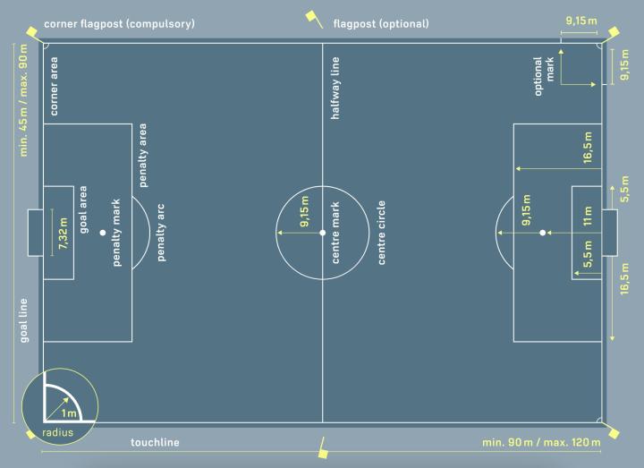 可以在距离角弧 9.15 米处与球门线和边线成直角的比赛场地进行标记。