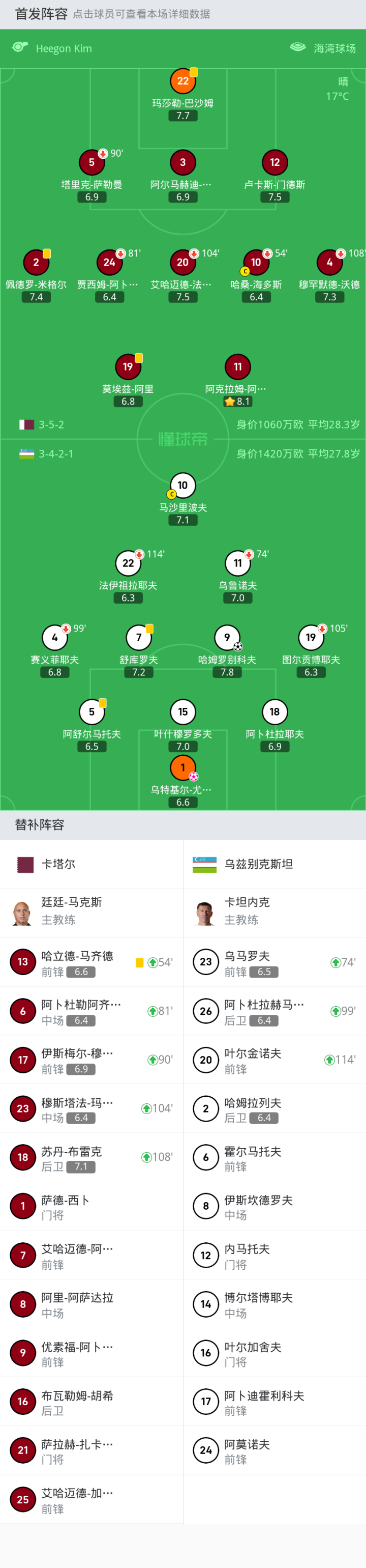 上场替补:74'23-乌马罗夫, 114'20-叶尔金诺夫, 99'26-阿卜杜拉赫马托夫