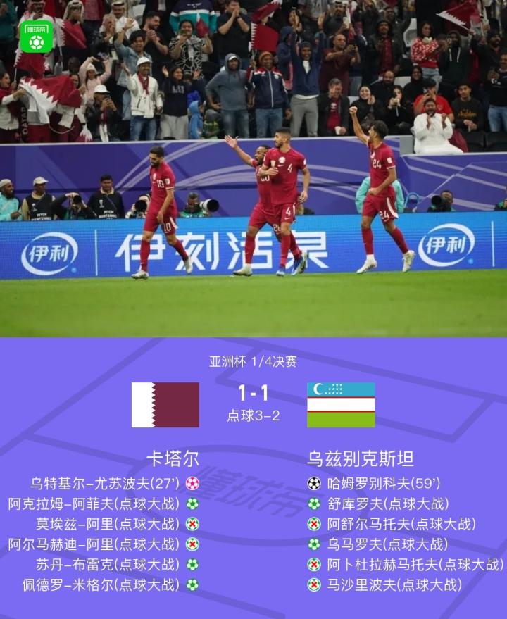 北京时间2月3日亚洲杯1/4决赛,卡塔尔对阵乌兹别克斯坦。上半场尤苏波夫扑救失误自摆乌龙;下半场哈姆罗别科夫破门扳平比分,伤停补时阶段阿菲夫兜射造险;加时赛阶段莫埃兹-阿里造险,双方均无建树;点球大战,双方前四轮分别罚丢2粒点球,最后一轮,马沙里波夫罚丢,佩德罗-米格尔制胜,最终卡塔尔总比分4-3战胜乌兹别克斯坦,拿到了亚洲杯四强的最后一个名额。