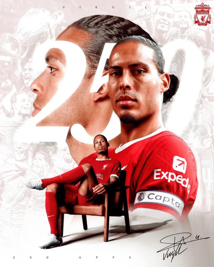 范戴克迎来利物浦生涯250场纪念,红军官方发布海报祝贺