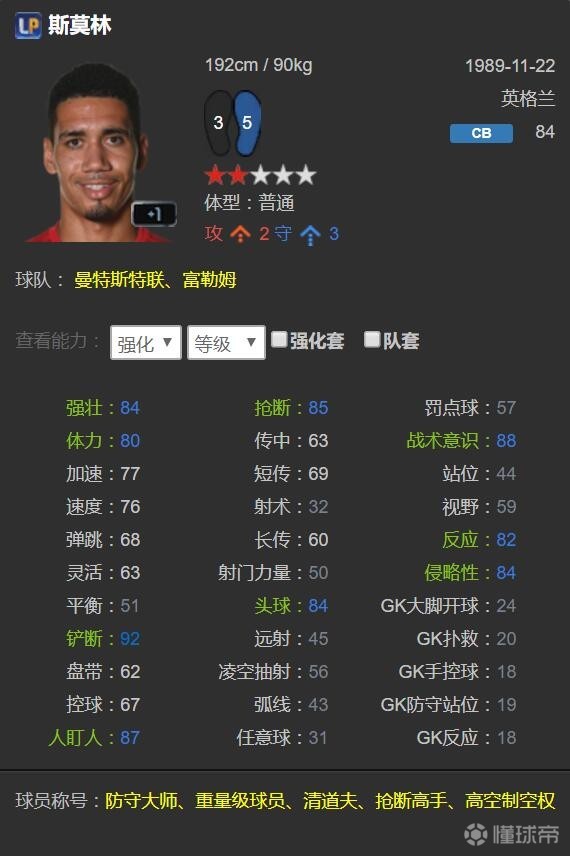 192cm的身高90公斤的体重,很好的中卫模型,不管是游戏还是现实中,斯莫林都是一个头球好大局观好速度快非常灵活的大个子,特别是他的贴身防守让很多前锋都非常恼火却又无奈,虽然有时候比较冒失,但关键时刻不会犯大错误 。LP斯莫林84能力值高于EC赛季的83能力值,但是很多防守重要属性EC斯莫林却更好,从市场价格上就能看出来哪张卡更受欢迎。